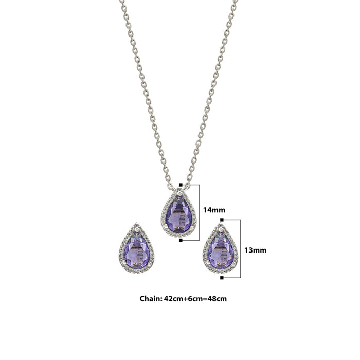 This drop shaped elegant set with earrings is a beautiful piece of jewellery with a nice wine color giving a deep berry & grape hue. It looks ravishing set inside a drop frame lined with tinier bling crystals. It is perfect for a fancy evening.