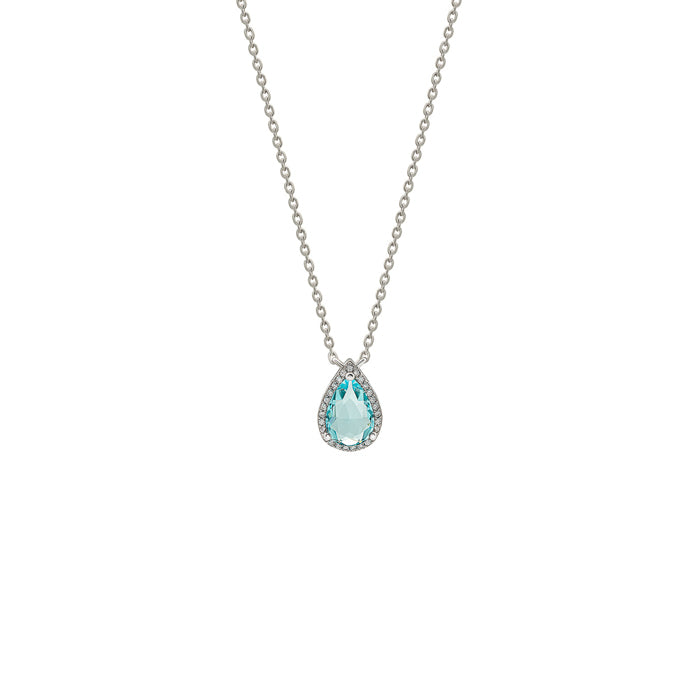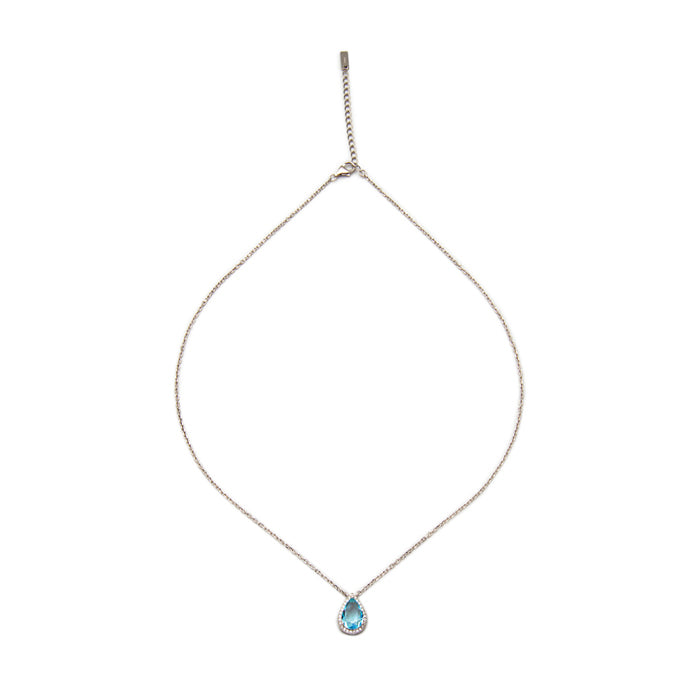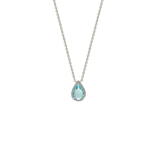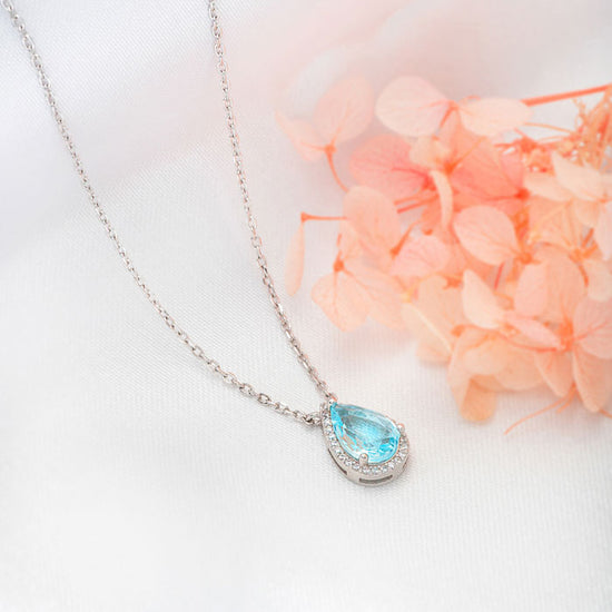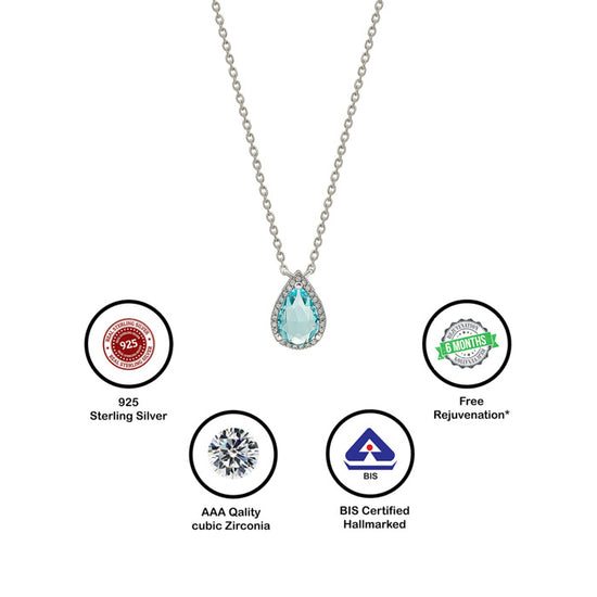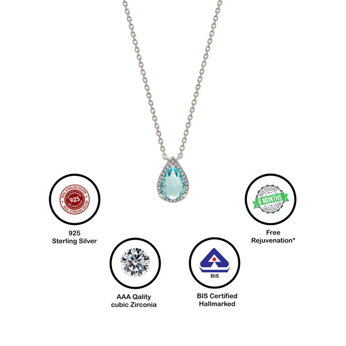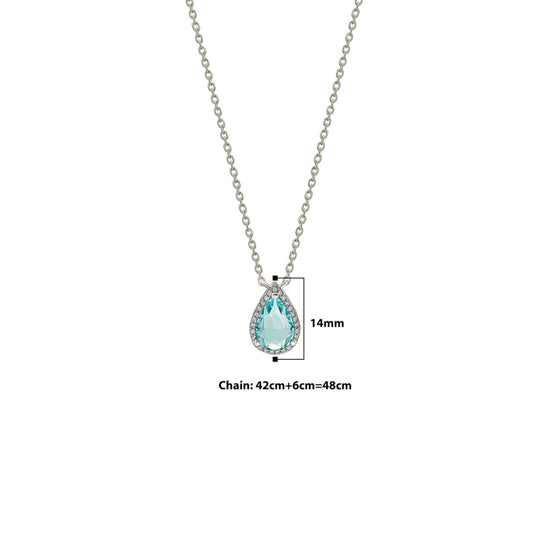 This is a pure silver necklace for women. It has a unique aqua color and a lovely ocean dew drop shape. It is a dew blue crystal lined with smaller crystals in white around the main pendant. The necklace is incredible and will go with major traditional outfits and stunning gowns too.