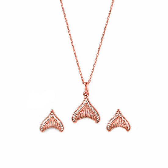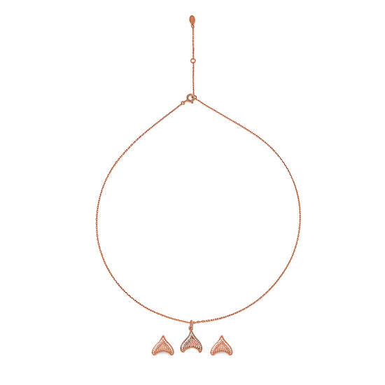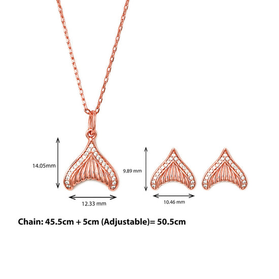 The Mermaid's Tail Pendant Set is expertly crafted from high-quality rose gold-plated sterling silver. The rose gold plating imparts a warm and captivating hue that complements a variety of skin tones. The pendant and chain are nickel-free, making them suitable for individuals with sensitive skin.