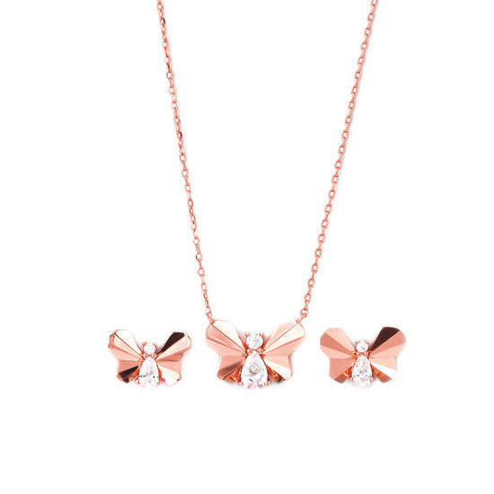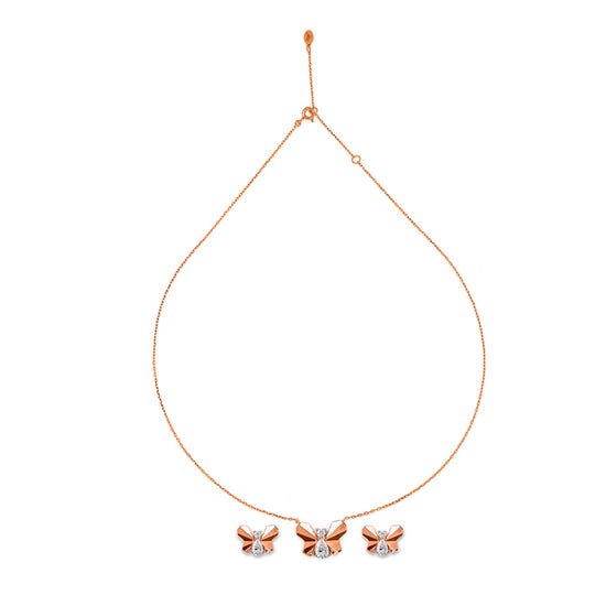 The Social Butterfly Pendant Set is expertly crafted from high-quality rose gold-plated sterling silver. The rose gold plating adds a warm and enchanting hue to the set, complementing various skin tones and providing a durable, long-lasting shine. The jewelry is nickel-free, ensuring comfort for those with sensitive skin.