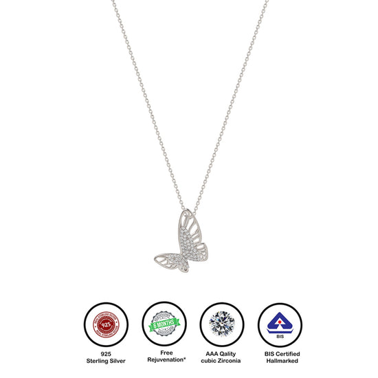 Stunning silver butterfly that catches every glimmer of light. This graceful pendant adds instant charm to any look—timeless, versatile, and absolutely irresistible. A piece you'll reach for again and again.