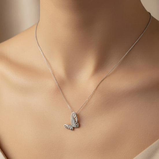 Delicate wings in gleaming silver, ready to flutter around your neck. This charming butterfly necklace brings a touch of whimsy and grace to any outfit. Perfect for nature lovers and those who appreciate delicate, meaningful jewelry that celebrates transformation and beauty.