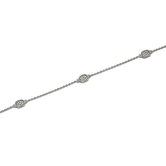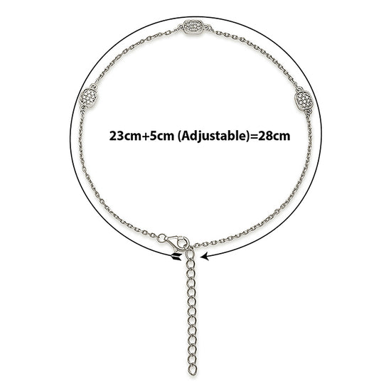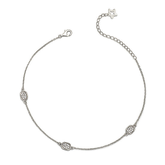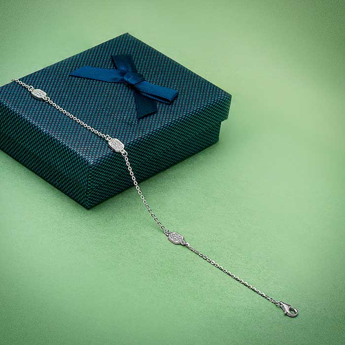 This is a genuine silver anklet for women. This anklet has cylinder-shaped elements placed at fine distances, studded with crystal overalls. It looks bewitching yet like a humble design. This can be a great wear at functions and special occasions.