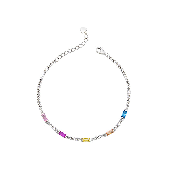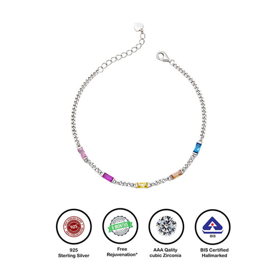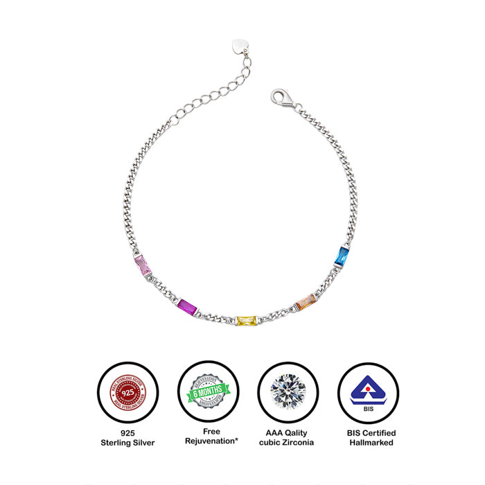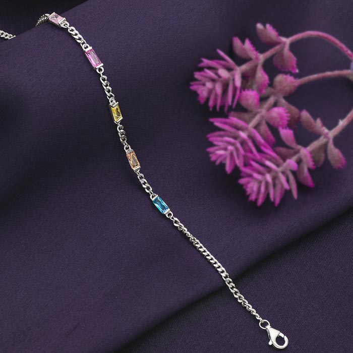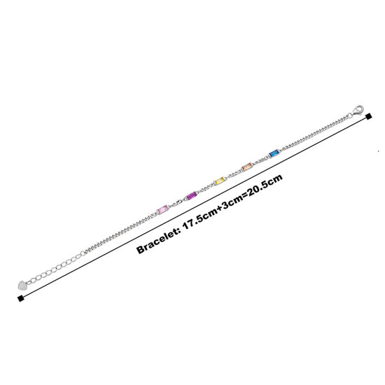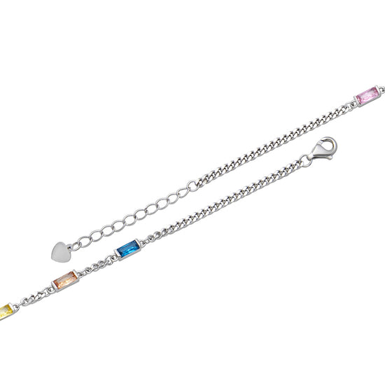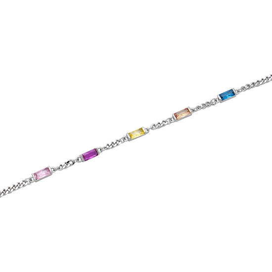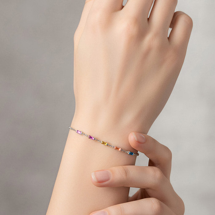 Rainbow on your wrist! This silver multicolor bracelet is a burst of joy in jewelry form. With its vibrant mix of hues set against gleaming silver, it's the ultimate accessory for adding instant personality to any outfit. Fun, fearless, and totally you.